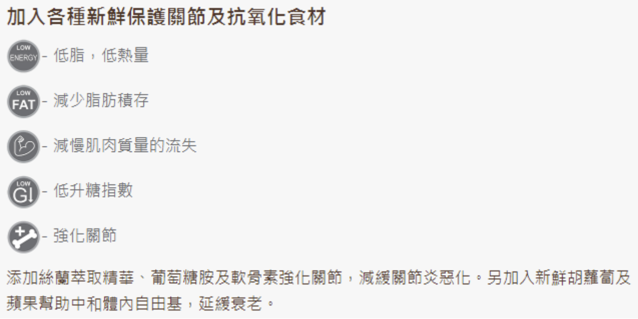 雞肉粉、糙米、燕麥、番薯、甜菜漿、小米、雞肉脂肪(與生育酚,即維他命E混合)、天然雞肝調味、大麥、蛋粉、亞麻籽粉、苜蓿草粉、豌豆、小紅莓、藍莓、DL-蛋氨酸、乾紅蘿蔔、乾菠菜、蘋果渣、氯化鈉、番茄渣、螯合氯化鉀、卵磷脂、磷酸二鈣、螯合氯化膽鹼、L-離氨酸、磷酸二氫鈉、葡萄糖氨鹽酸鹽、軟骨膠硫酸鹽、乾嗜酸乳桿菌發酵物、枯草芽孢桿菌發酵產物、乾雙歧桿菌嗜熱發酵物、乾長雙歧桿菌發酵物、乾屎腸球菌發酵物、絲蘭萃取物、鋅蛋白、維他命E補充劑、煙酸、硫酸鋅、螯合硫酸亞鐵、核黃素、螯合銅蛋白、螯合錳蛋白、維他命A補充劑、螯合硫酸銅、d-泛酸鈣、維他命B12補充劑、螯合硫酸錳、生物素 (維他命B7)、維他命D3補充劑、螯合鈷蛋白、硫胺素硝酸鹽 (維他命B1硝酸鹽 )、葉酸 (維他命B9)、螯合亞硒酸鈉、螯合碘酸鈣