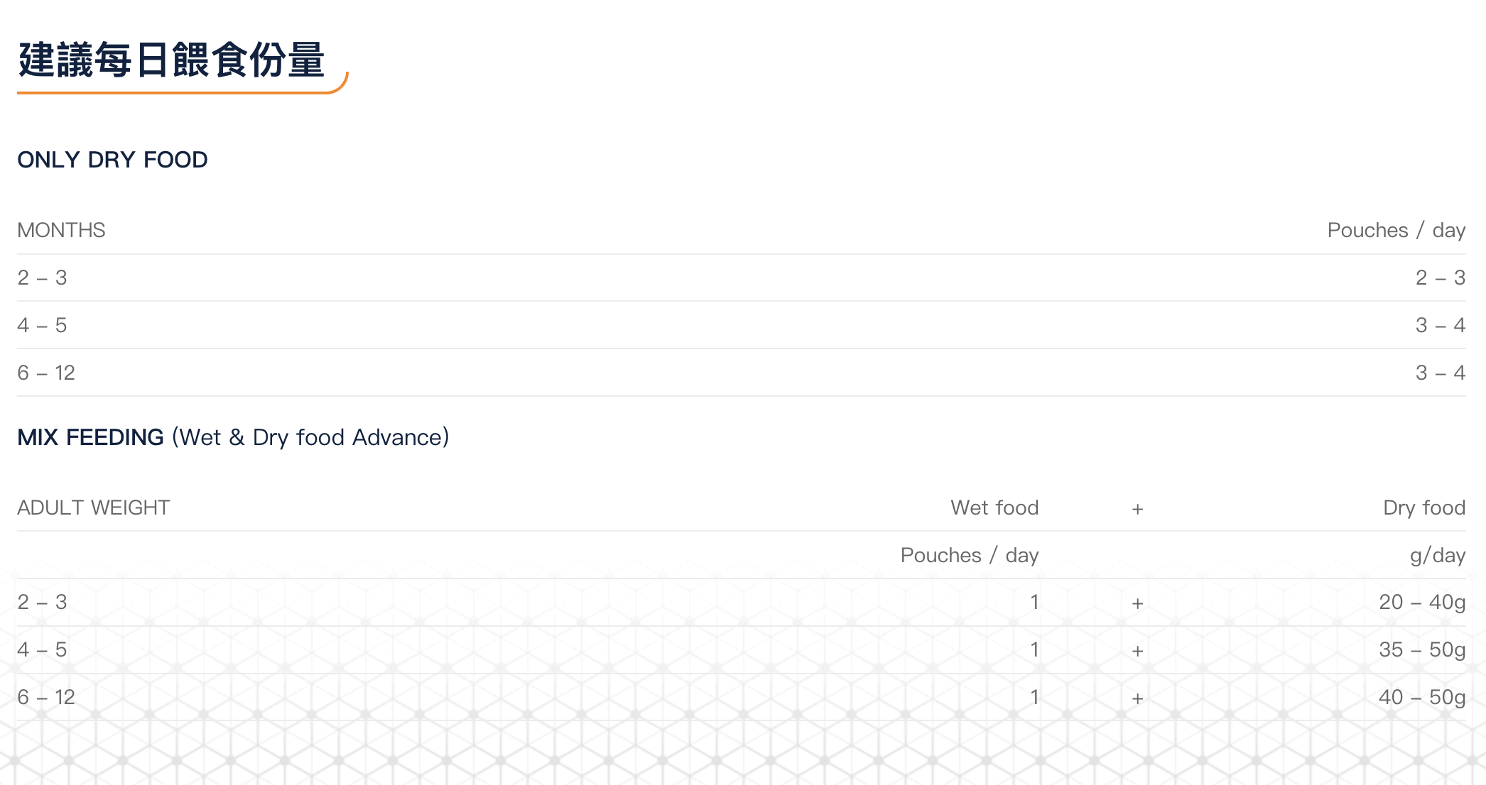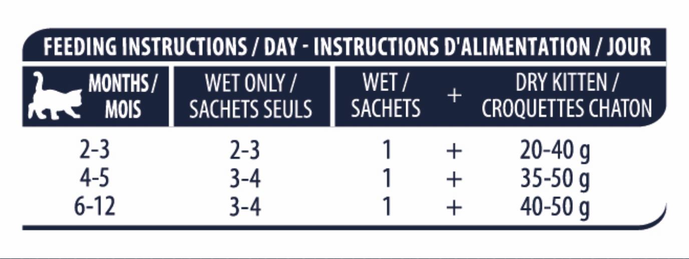 ADVANCE濕糧由蒸煮烹調的優質原料製成,結合鮮肉粒及鮮肉汁,使幼貓更容易咀嚼。可將此濕糧與乾糧混合餵食,讓幼貓獲得更多口感和味道;或可100%餵食濕糧,給幼貓完整且均衡營養。