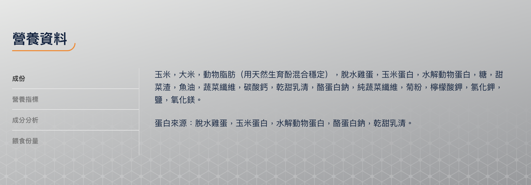 玉米,大米,動物脂肪(用天然生育酚混合穩定),脫水雞蛋,玉米蛋白,水解動物蛋白,糖,甜菜渣,魚油,蔬菜纖維,碳酸鈣,乾甜乳清,酪蛋白鈉,純蔬菜纖維,菊粉,檸檬酸鉀,氯化鉀,鹽,氧化鎂。