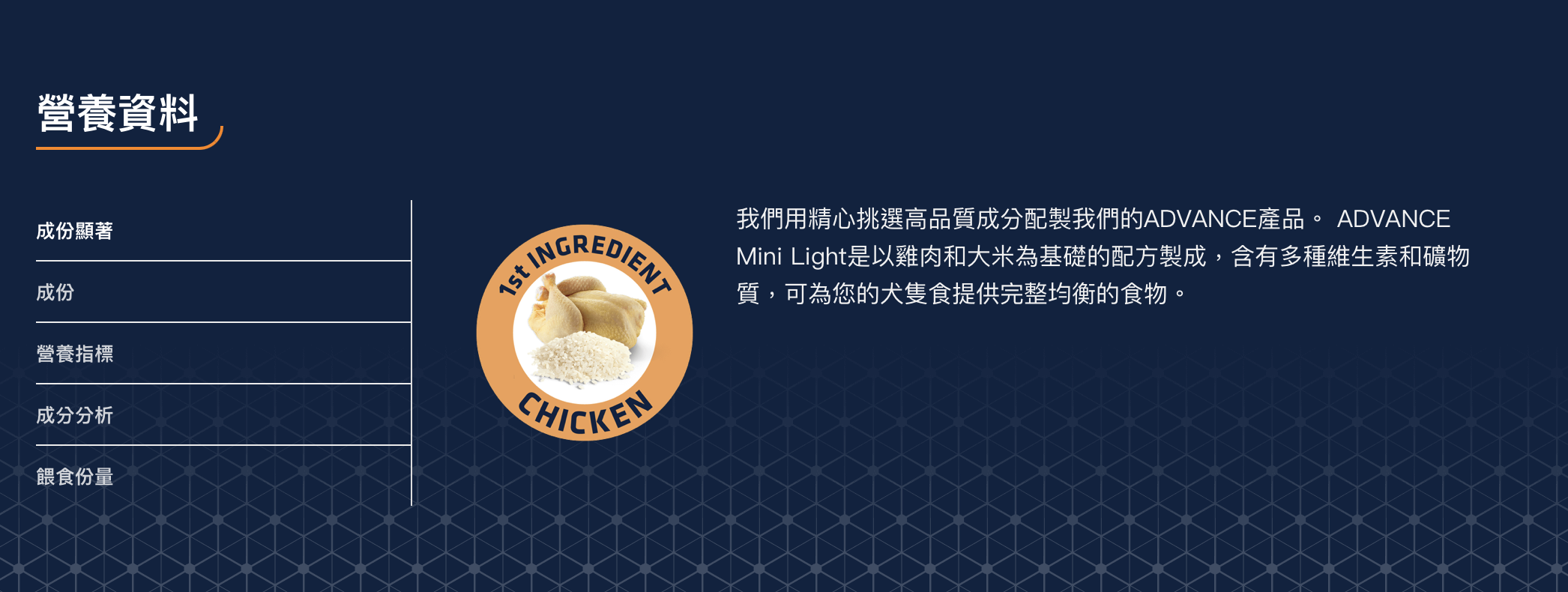 我們用精心挑選高品質成分配製我們的ADVANCE產品。 ADVANCE特殊護理中/大型型成犬糧-輕體配方是以雞肉和大米為基礎的配方製成,含有多種維生素和礦物質,可為您的犬隻提供完整均衡的食物。
