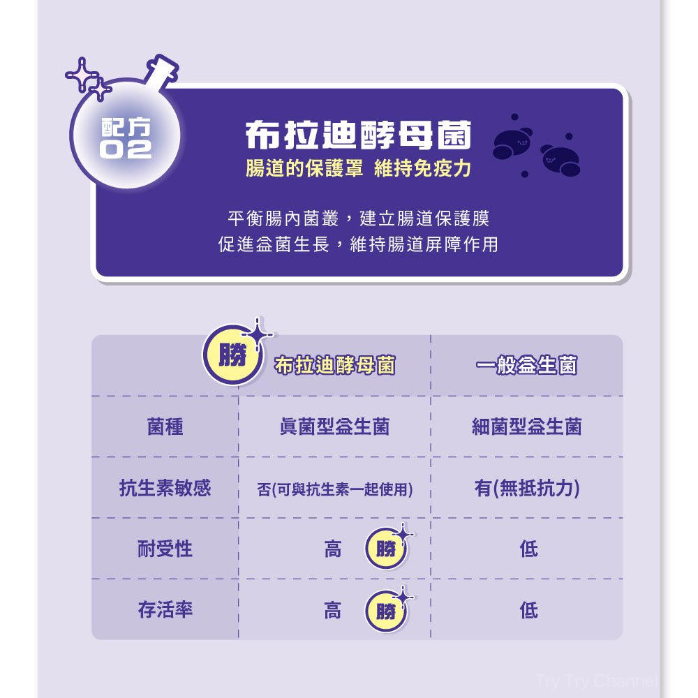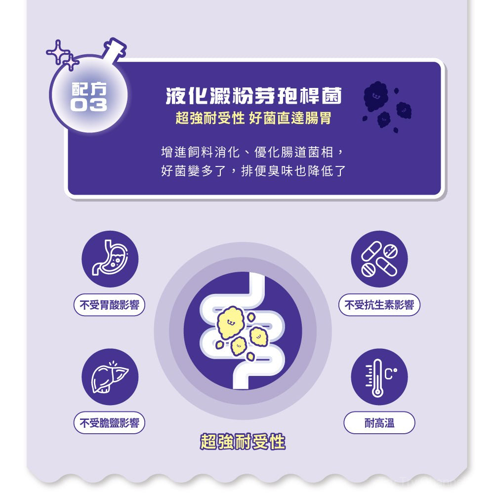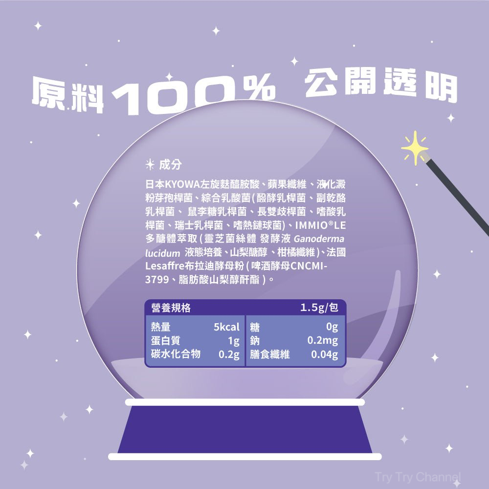 日本KYOWA左旋麩醯胺酸、蘋果纖維、液化澱粉芽孢桿菌、綜合乳酸菌(醱酵乳桿菌、副乾酪乳桿菌、 鼠李糖乳桿菌、長雙歧桿菌、嗜酸乳桿菌、瑞士乳桿菌、嗜熱鏈球菌)、IMMIO®LE多醣體萃取(靈芝菌絲體 發酵液 Ganoderma lucidum液態培養 、山梨醣醇 、柑橘纖維 )、法國Lesaffre布拉迪酵母粉 ( 啤酒酵母CNCMI-3799、脂肪酸山梨醇酐酯 )