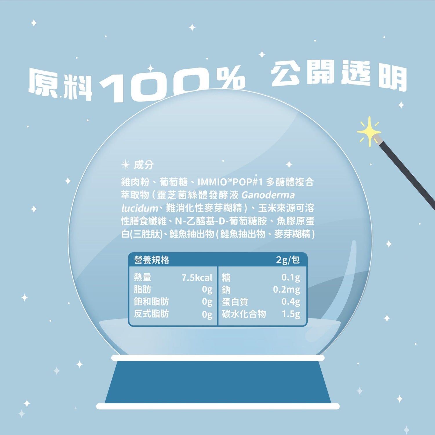 雞肉粉、葡萄糖、IMMIO®POP#1 多醣體複合萃取物 ( 靈芝菌絲體發酵液Ganoderma lucidum、難消化性麥芽糊精 ) 、玉米來源可溶性膳食纖維、N-乙醯基-D-葡萄糖胺、魚膠原蛋白(三胜肽)、鮭魚抽出物 ( 鮭魚抽出物、麥芽糊精 )
