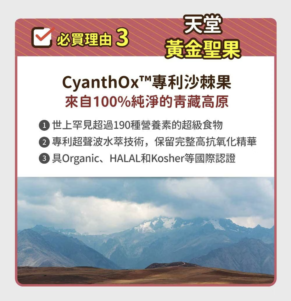 ✔抗氧化神果 ( 沙棘果 ) : 富含Omega 3 有助降低壞膽固醇 ;