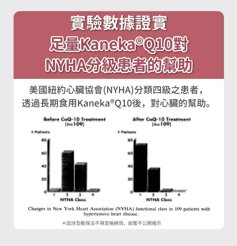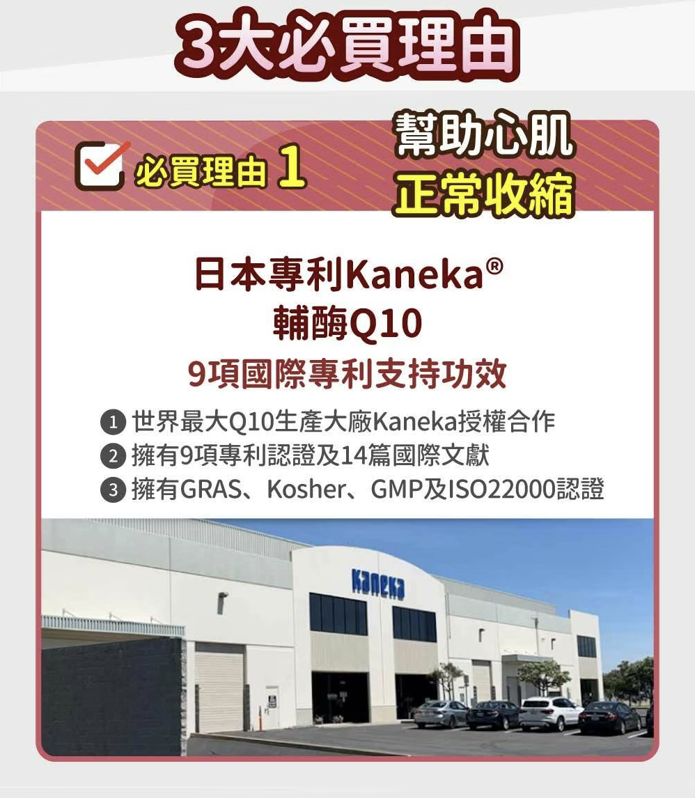 ✔日本專利輔酶 Kanekao Q10 : 減少自由基的傷害,所以對於心臟血管疾病(缺血性心臟衰竭、心律不整、高血壓等)的改善有效 ;