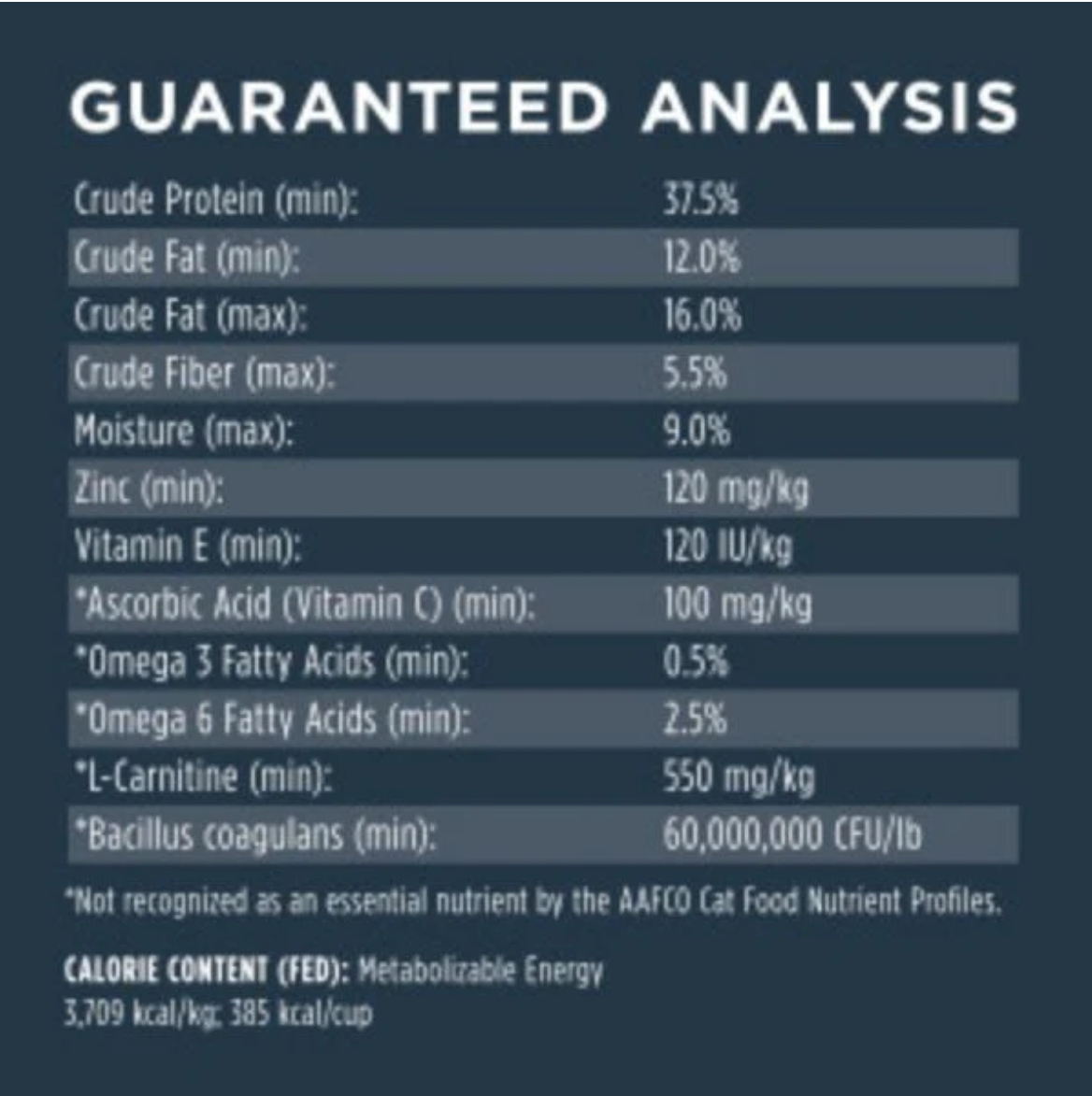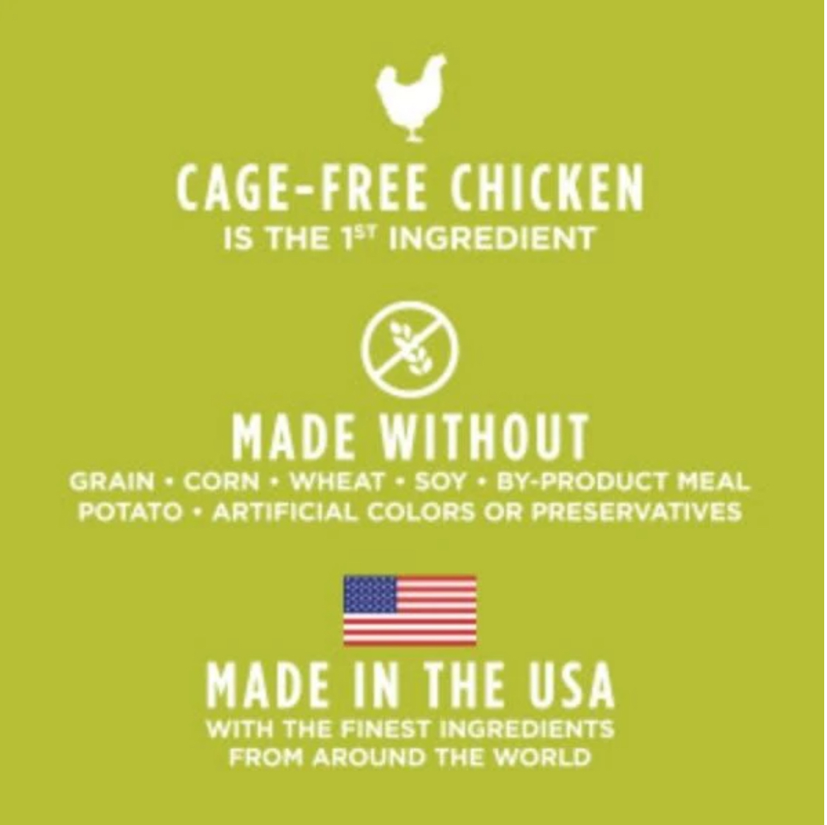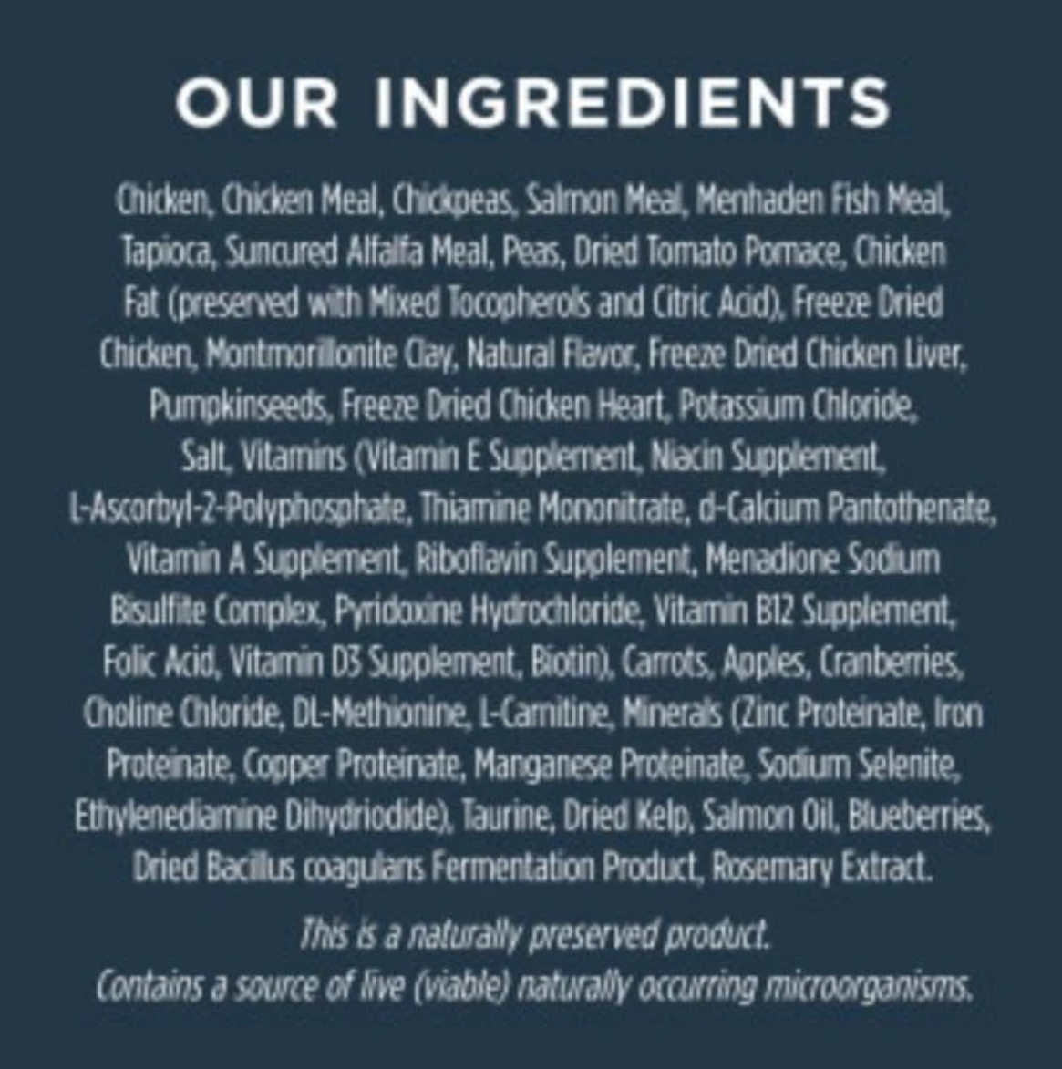 雞肉、雞肉粉、鷹嘴豆、三文魚粉、鯡魚粉、木薯粉、曬乾紫花苜蓿粉、豌豆、幹番茄渣、雞脂肪(用混合生育酚和檸檬酸保存)、凍乾雞、蒙脫石粘土、天然香料、凍乾雞肝、南瓜子、凍乾雞心、氯化鉀、鹽、維生素(維生素 E 補充劑、菸酸補充劑、L-抗壞血酸 2-聚磷酸鹽、單硝酸硫胺素、d-泛酸鈣、維生素 A 補充劑、核黃素補充劑、甲萘醌亞硫酸氫鈉複合物、鹽酸吡哆醇、維生素 B12 補充劑、葉酸、維生素 D3 補充劑、生物素)、胡蘿蔔、蘋果、蔓越莓、氯化膽鹼、DL-蛋氨酸、L-肉鹼、礦物質(蛋白質鋅、蛋白質鐵、蛋白質銅、蛋白質錳、亞硒酸鈉,乙二胺二氫碘化鈉),牛磺酸、乾海帶、鮭魚油、藍莓、幹凝結芽孢桿菌發酵產物、迷迭香提取物。