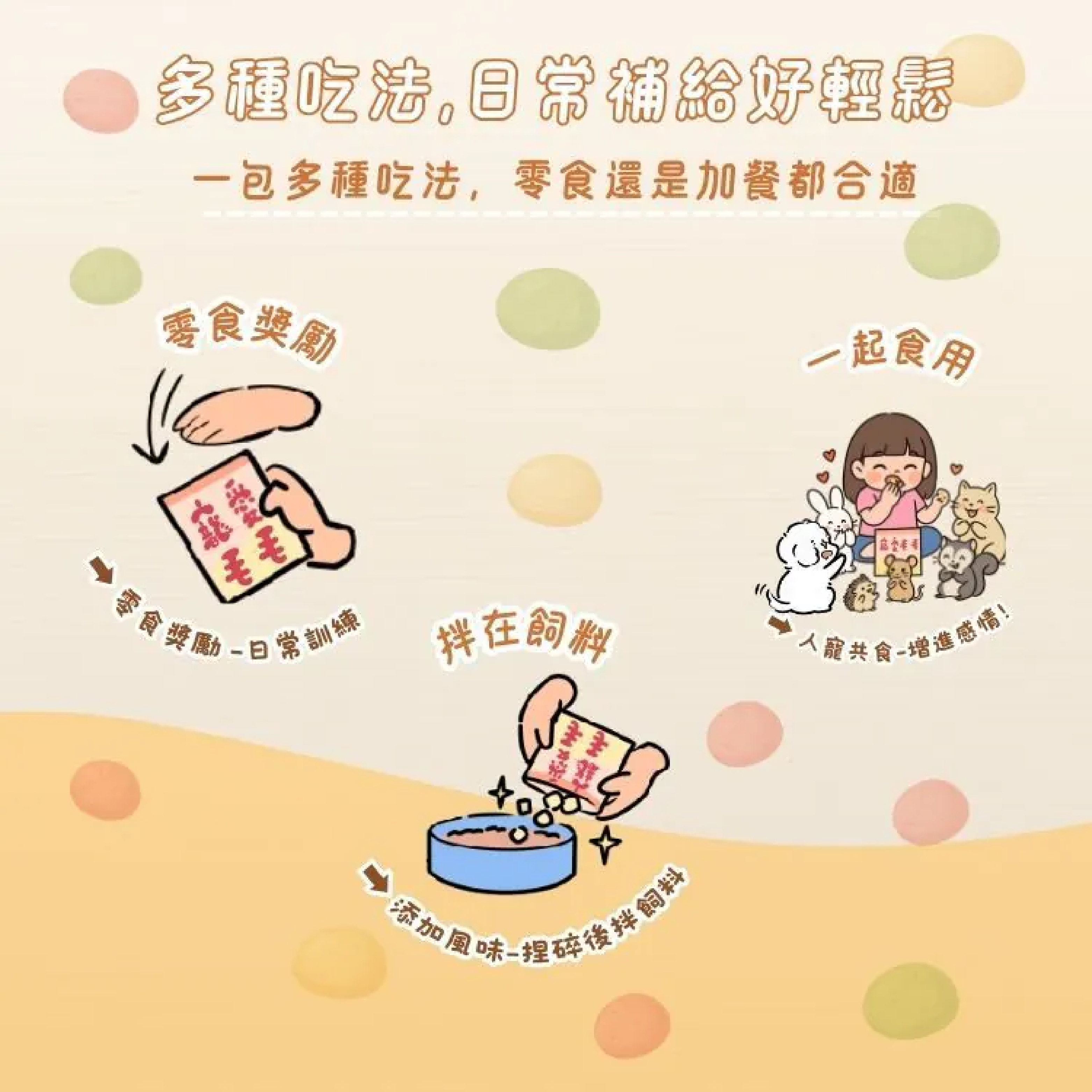 本產品為營養零食,請依毛孩體型適量給予,勿作為正餐。