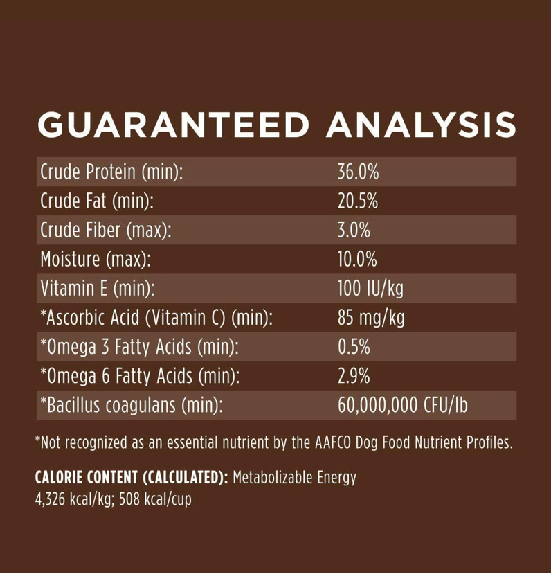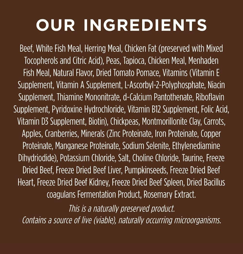 牛肉、白魚粉、鯡魚粉、雞脂肪(用混合生育酚和檸檬酸保存)、豌豆、木薯粉、雞肉粉、鯡魚粉、天然香料、凍乾牛肉、凍乾牛肝、南瓜子、幹番茄渣、 凍乾牛心、凍乾牛腎、凍乾牛脾、蒙脫石粘土、維生素(維生素 E 補充劑、維生素 A 補充劑、L-抗壞血酸 2-聚磷酸鹽、菸酸補充劑、單硝酸硫胺素、d-泛酸鈣、核黃素補充劑、 鹽酸吡哆醇、維生素 B12 補充劑、葉酸、維生素 D3 補充劑、生物素)、鷹嘴豆、胡蘿蔔、蘋果、蔓越莓、礦物質(蛋白質鋅、蛋白質鐵、蛋白質銅、蛋白質錳、亞硒酸鈉、乙二胺二氫碘化物)、氯化鉀、鹽 、氯化膽鹼、牛磺酸、乾海帶、鮭魚油、藍莓、幹凝結芽孢桿菌發酵產物、迷迭香提取物。