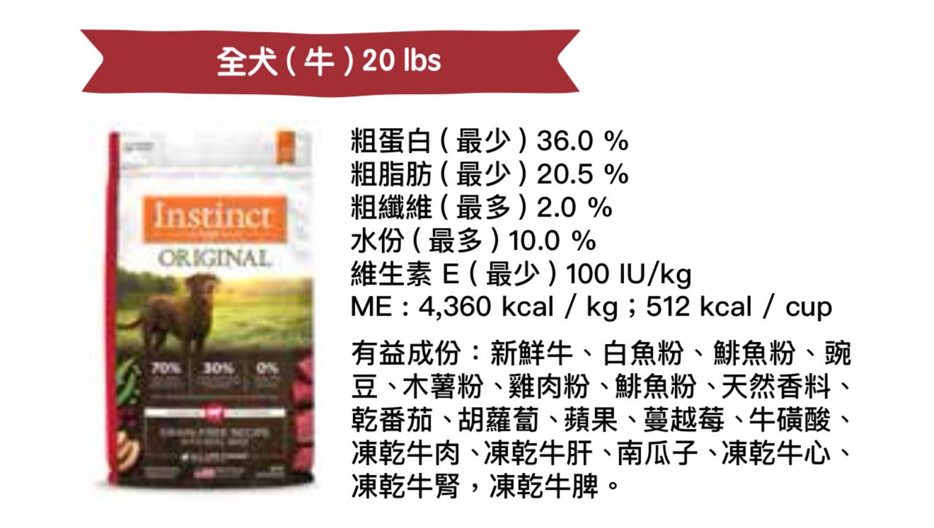 .選用高動物蛋白、無穀物、增强營養的冷凍生肉,Instinct Raw Boost無穀物雞肉配方是一個更好用於喂養的狗糧。釋放你的狗的潜力茁壯成長,還把更多的純淨,真正的營養原料帶給狗狗。