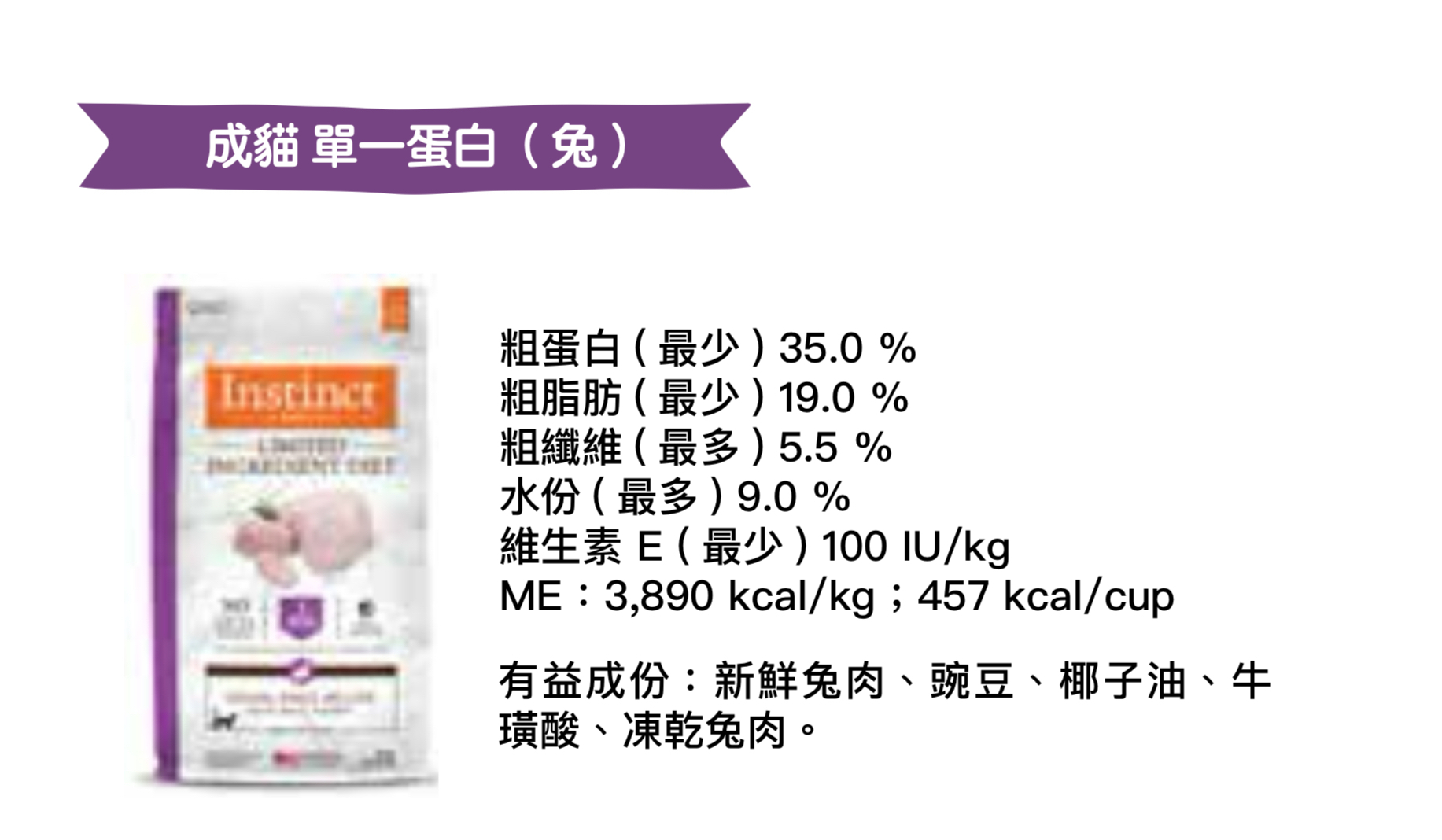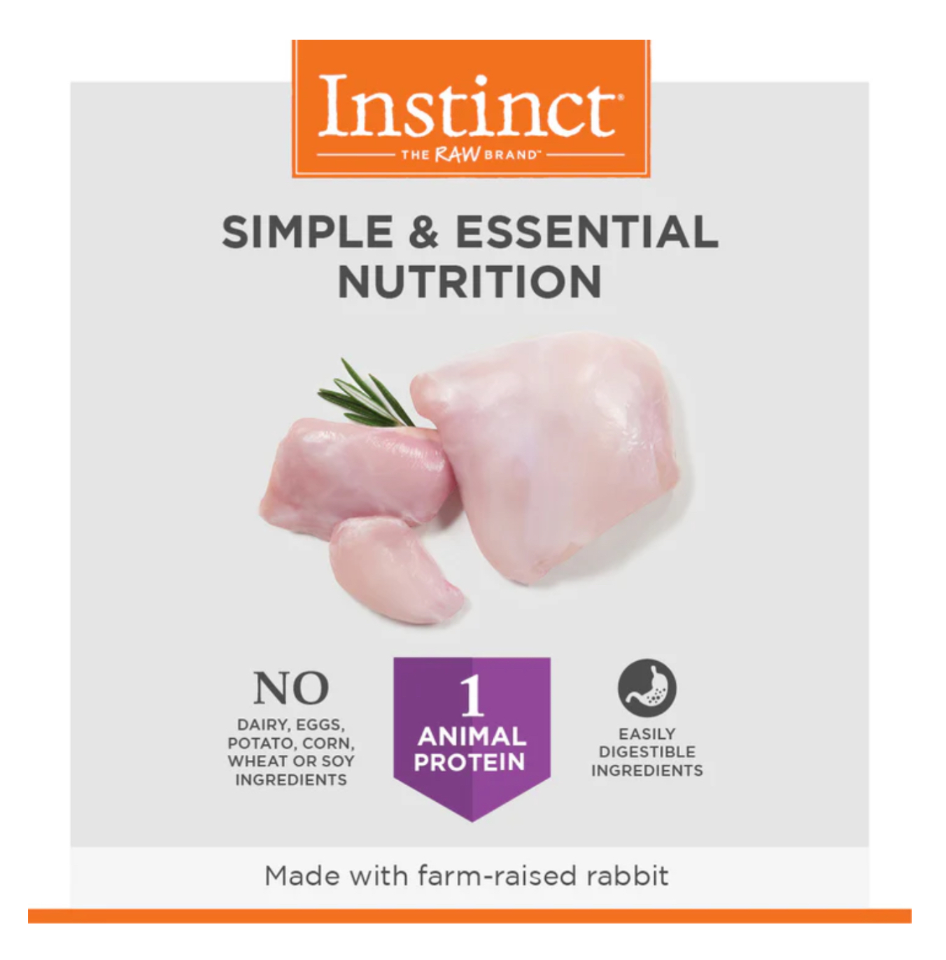 當你的貓有食物敏感性時,確切知道食物中的含量是非常重要的。這就是為什麼我們的成分清單是有目的的短,用一種動物蛋白和一種蔬菜製成,而不是你在大多數其他貓糧中找到的混合物。憑藉純淨和簡單的原料,Instinct有限成分飲食無穀物食譜與真正的兔子是你的貓需要茁壯成長的簡單和必要的營養。 有目的地簡單的食品敏感成分列表 - 一個動物蛋白和一個蔬菜 用養殖的兔子製成 - 一種營養豐富,易消化的蛋白質,提供所有必需氨基酸 無穀物,乳製品,雞蛋,雞肉,牛肉,魚,甘藷,馬鈴薯,鷹嘴豆,玉米,小麥,大豆,人造色素或防腐劑 保證天然Omega和抗氧化劑的水平,健康的皮膚和外套,以及免疫健康 唯一有限的成分飲食粗磨,每一塊都有純正的真正營養