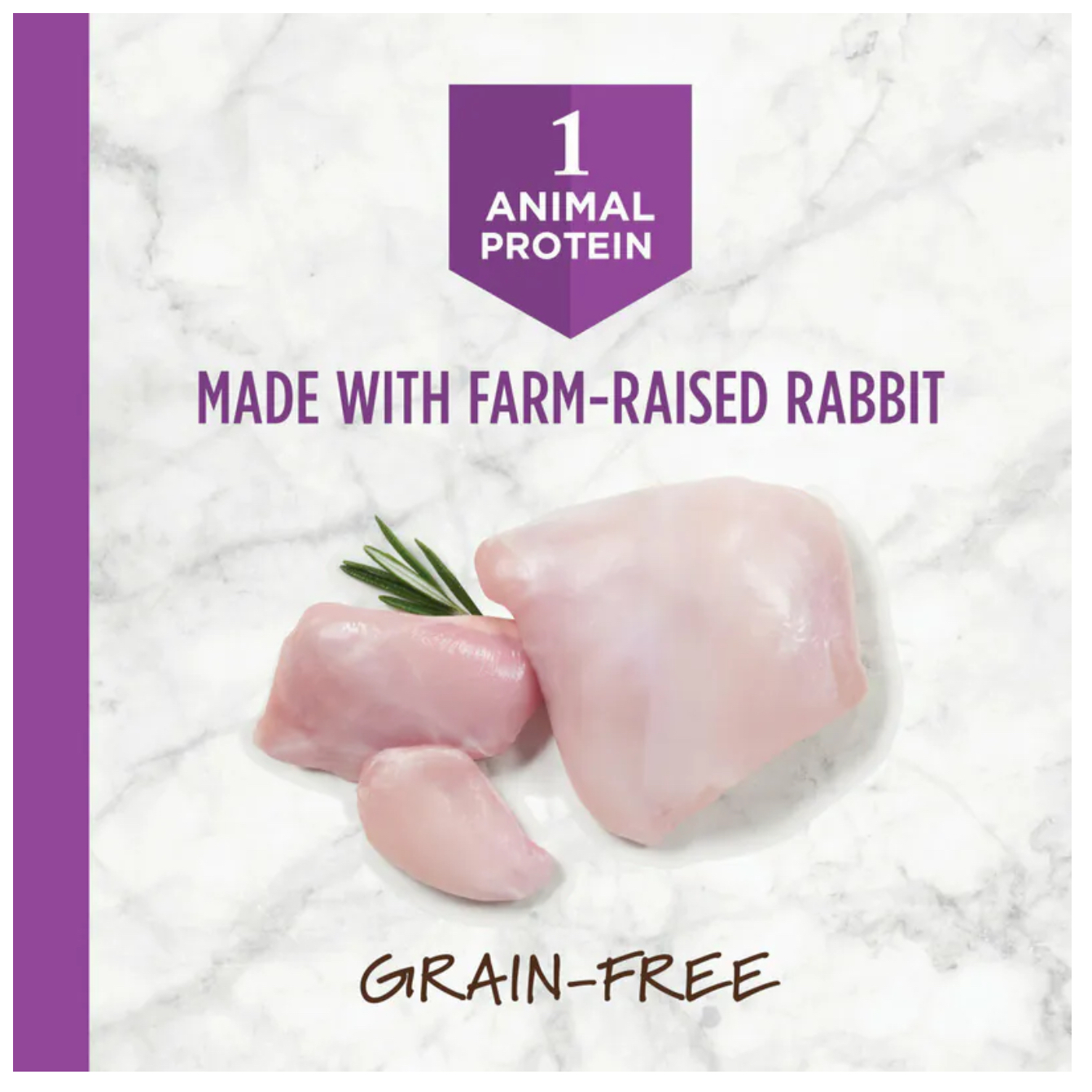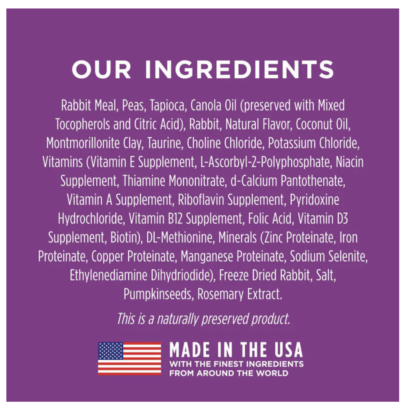 兔膳食,豌豆,豌豆,木薯油,菜籽油(混合生育酚和檸檬酸保存),兔肉,天然香料,椰子油,蒙脫石粘土,牛磺酸,氯化膽鹼,氯化鉀,維生素(維生素E補充劑,L-抗壞血酸2-聚磷酸鹽,菸酸補充劑,硫胺素單硝酸鹽,d-Calcium Pantothenate,維生素A補充劑,核黃素補充劑,鹽酸吡哆醇,維生素B12補充劑,葉酸,維生素D3補充劑,生物素),DL-蛋氨酸,礦物質(蛋白質鋅,蛋白質鐵,銅)蛋白質,錳蛋白酸鹽,亞硒酸鈉,乙二胺二氫碘化物),凍乾兔,鹽,南瓜籽,迷迭香提取物