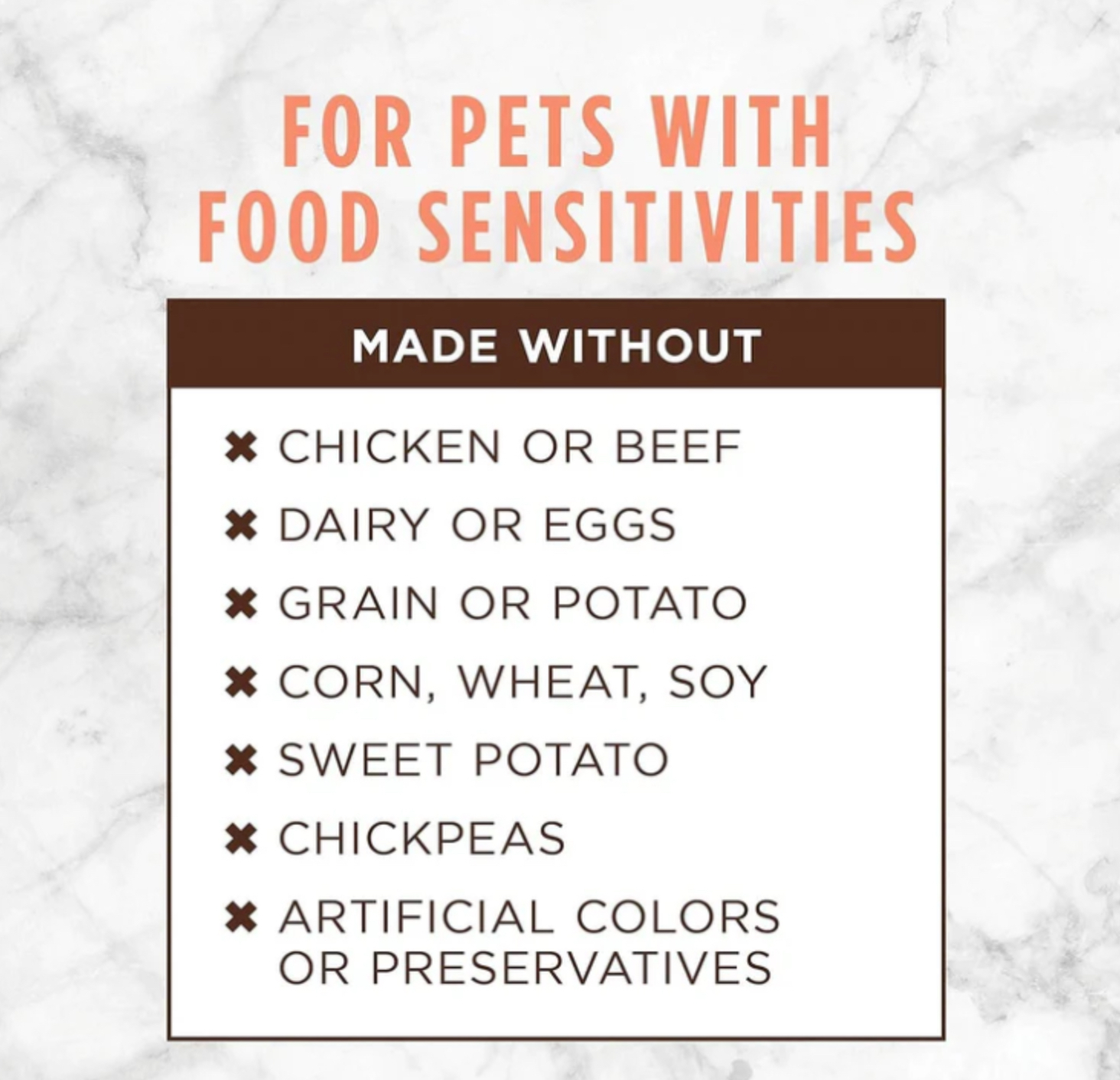 • 不含穀物、乳製品、雞蛋、雞肉、牛肉、地瓜、馬鈴薯、鷹嘴豆、玉米、小麥、大豆、人工色素或防腐劑。