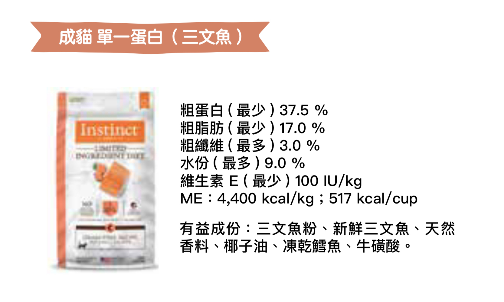 即使貓咪有食物敏感,也不意味著她不能享受美味的營養。Instinct有限成分食譜無穀物配方真三文魚凍乾原料混合成的成年貓乾糧,經過特別精心調製,採用極少的成分,只有一種動物蛋白質、一種蔬菜,並且不含乳製品、雞蛋、馬鈴薯、玉米、小麥或大豆。這種易於消化的無穀物乾糧在美國製造,並與凍乾的生鱈魚混合,以幫助保留其營養和風味。而且,由於您的最佳朋友值得真正的營養,您在這裡永遠找不到任何人工色素或防腐劑!