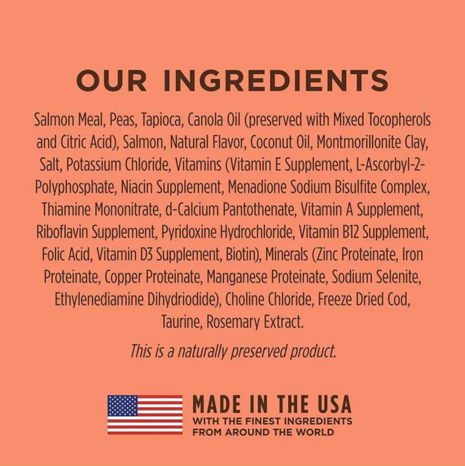 三文魚粉、豌豆、木薯粉、菜籽油(用混合生育酚和檸檬酸保存)、鮭魚、天然香料、椰子油、蒙脫土、鹽、氯化鉀、維生素(維生素E 補充劑、L-抗壞血酸-2-多磷酸鹽、菸鹼酸)補充劑、甲萘醌亞硫酸氫鈉複合物、硝酸硫胺素、d-泛酸鈣、維生素A 補充劑、核黃素補充劑、鹽酸吡哆醇、維生素B12 補充劑、葉酸、維生素D3 補充劑、生物素)、礦物質(蛋白鋅、蛋白鐵、蛋白銅、蛋白錳、亞硒酸鈉、乙二胺二氫碘化物、氯化膽鹼、冷凍乾燥鱈魚、牛磺酸、迷迭香萃取物。