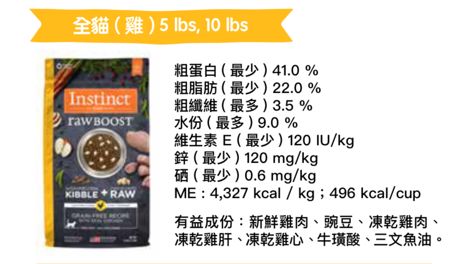 高動物蛋白質,無穀物,增加營養,叮咬凍乾生肉,Instinct Raw Boost無穀物配方與真正的雞肉是一種更好的餵養粗磨食物的方法。解鎖您的貓茁壯成長的潛力,並將更多純淨,真實的原料營養品放入每個碗中。 Boosted Nutrition - 無穀物,高蛋白粗磨+凍乾原料 無籠養的雞肉是第一種成分 - 含有動物蛋白質,適合強壯的瘦肌肉 冷凍乾燥原料 - 所有天然,蛋白質包裝,最低限度加工的真正雞肉叮咬 益生菌促進,更高的Omegas *和更多的抗氧化劑*用於消化健康,健康的皮膚和外套,以及免疫健康(*與Instinct Original相比) 無穀物,馬鈴薯,玉米,小麥,大豆,副產品,人造色素或防腐劑