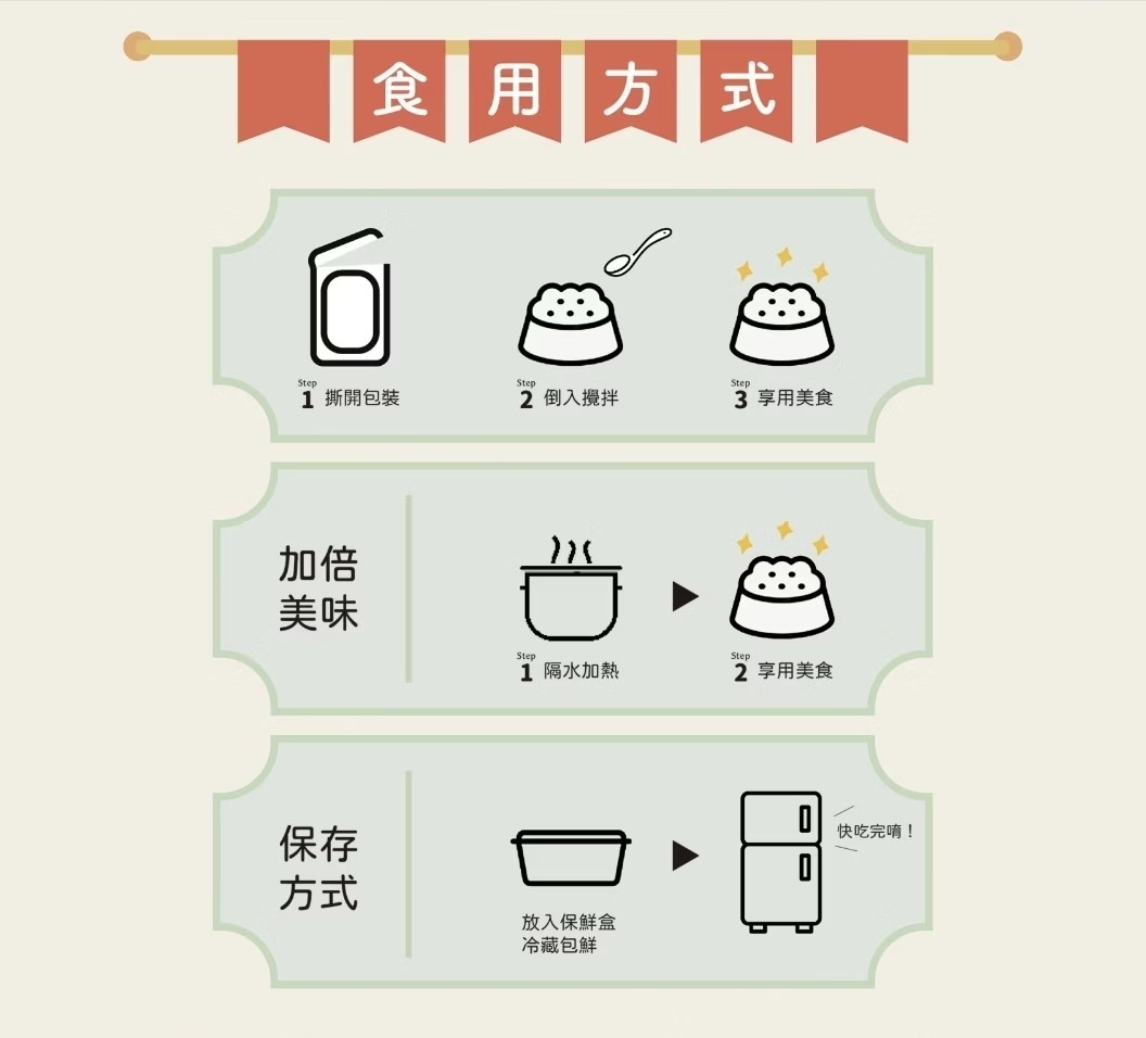 新鮮100%純肉蔬果製品,包裝皆使用高溫殺菌鋁箔帶,請常溫保存。