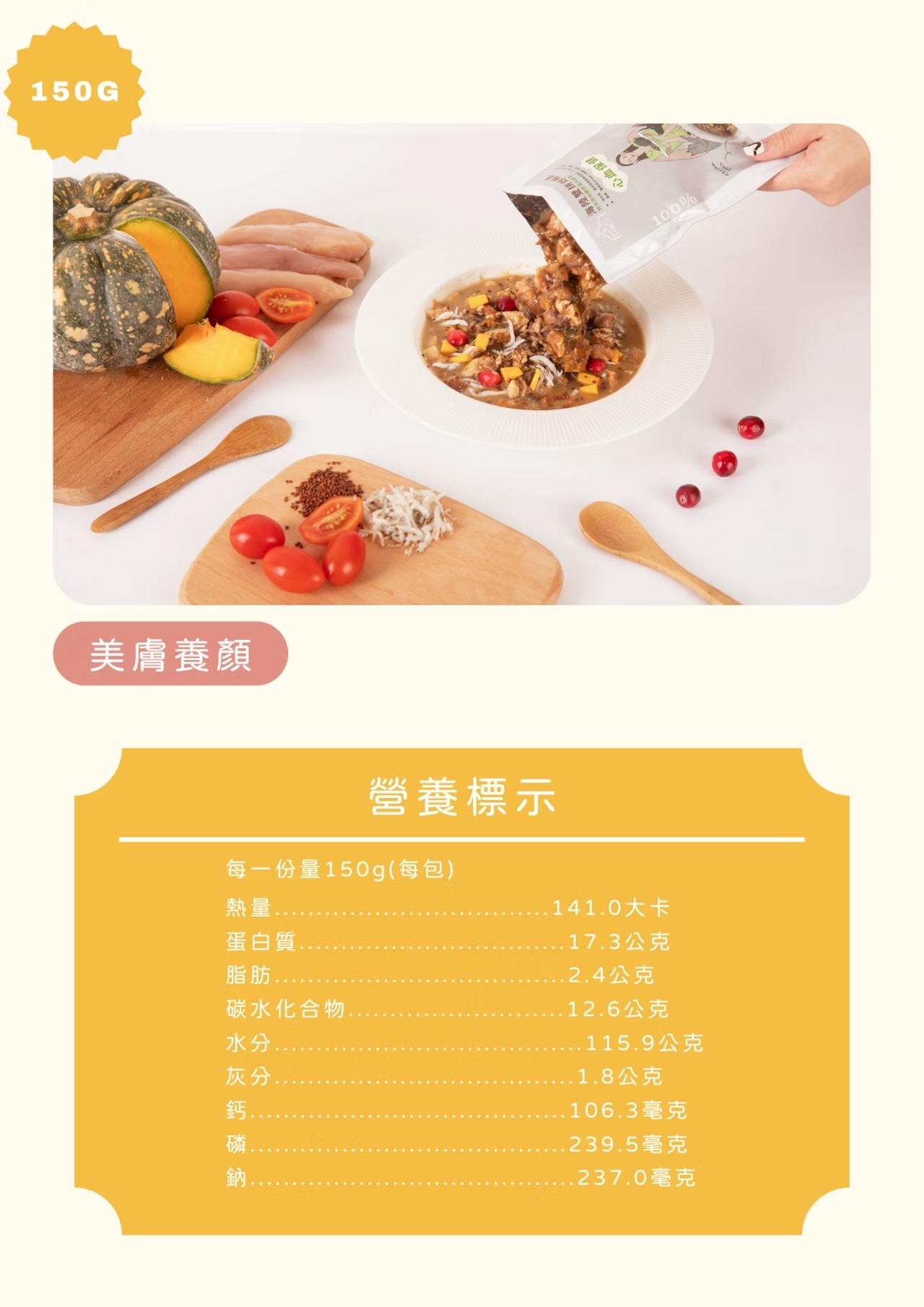 成分:雞胸肉、吻仔魚、南瓜、藜麥、番茄、覆盆莓、鷹嘴豆、膠原蛋白、魚油粉、初榨椰子油、綜合礦物質與維生素。
