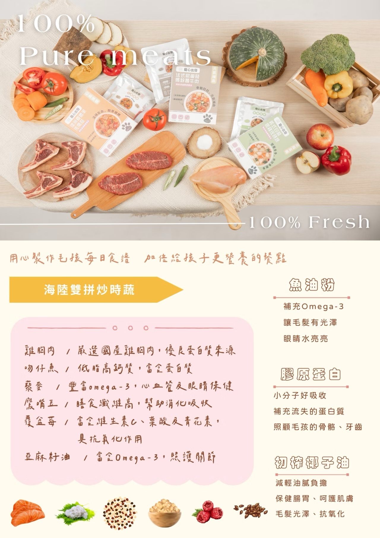 成分:鮭魚、山藥、薏仁、亞麻籽油、黑木耳、胡蘿蔔、菠菜、膠原蛋白、魚油粉、初榨椰子油、綜合礦物質與維生素。