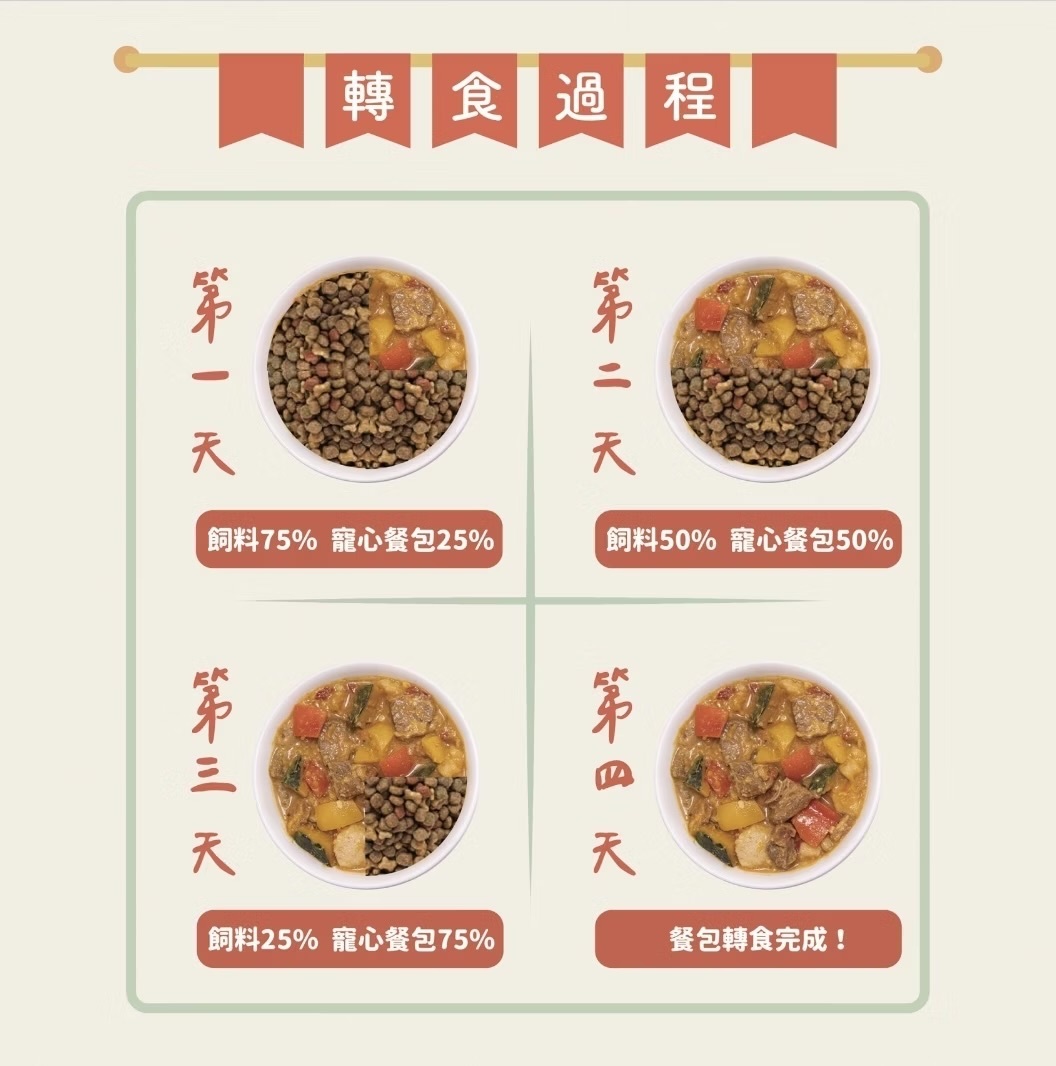 初次寶貝食用鮮食,請採漸進式換食法,與原飼料混合後,並逐漸增加給予的比例,讓毛孩的腸胃能夠適應。