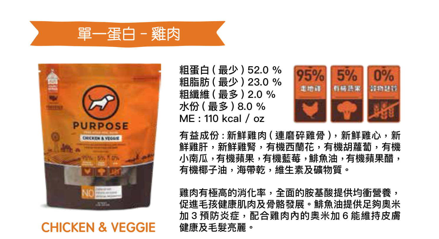 普斯雞肉配方由人道飼養的野生放養雞肉和有機水果製成。為您的毛孩提供誘人而富有營養的餐單。雞肉提供最全面的胺基酸,並擁有高吸收率,是所有毛孩不可或缺的蛋白質首選。