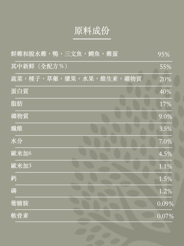 新鮮雞肉和鴨肉,脫水雞肉和鴨肉,紅薯,雞脂,豌豆,新鮮三文魚和鱒魚,新鮮全蛋,亞麻籽,馬鈴薯,肝臟,苜蓿芽,維生素,礦物質,MOS,FOS,葡糖胺*,軟骨素 -(*全部來自天然來源),小紅莓,巴西莓,藍莓,桑莓,蘋果,番茄,橙,梨,胡蘿蔔,菠菜,花椰菜,紫菜,萬壽菊,人參,綠茶,生薑。