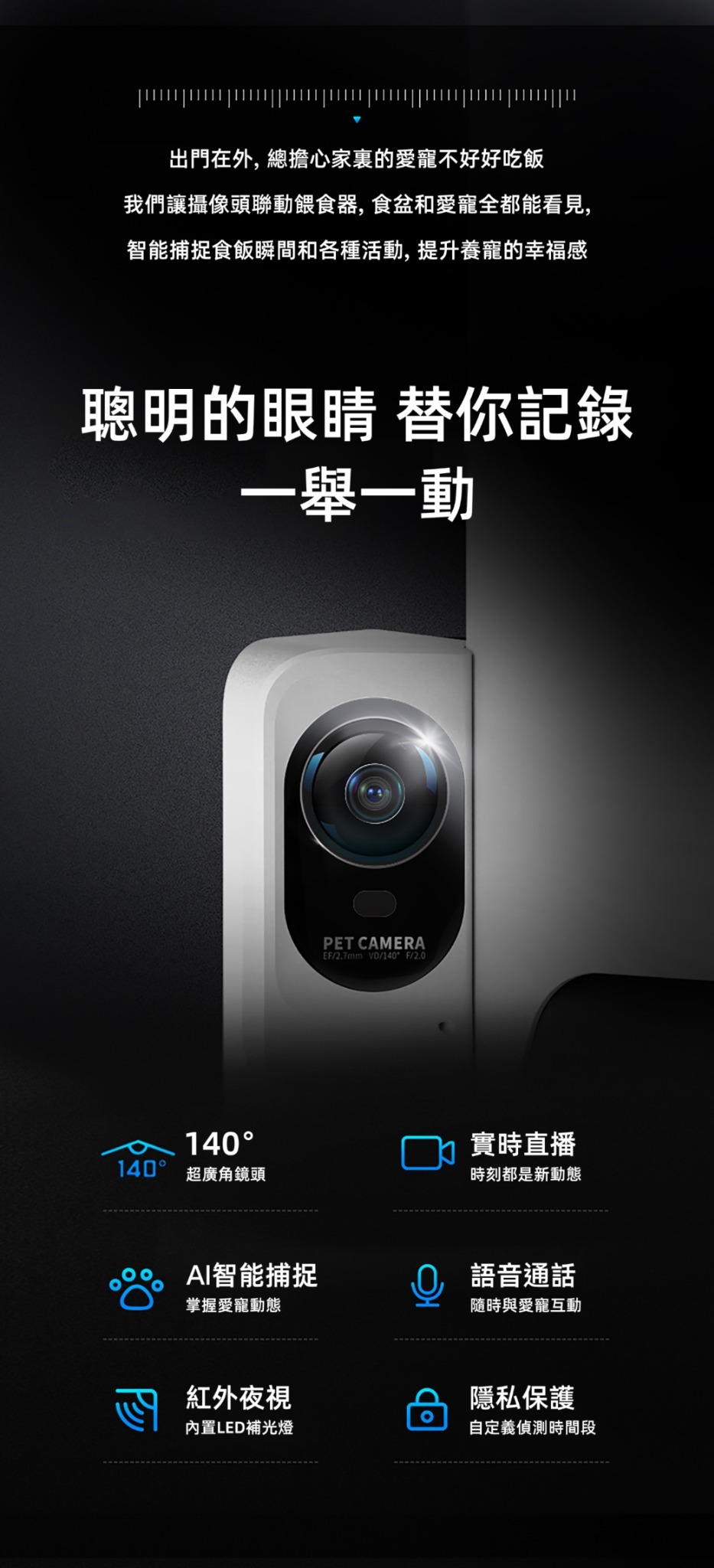 • 140°超廣角夜視鏡頭,食盆與愛寵全都看得見