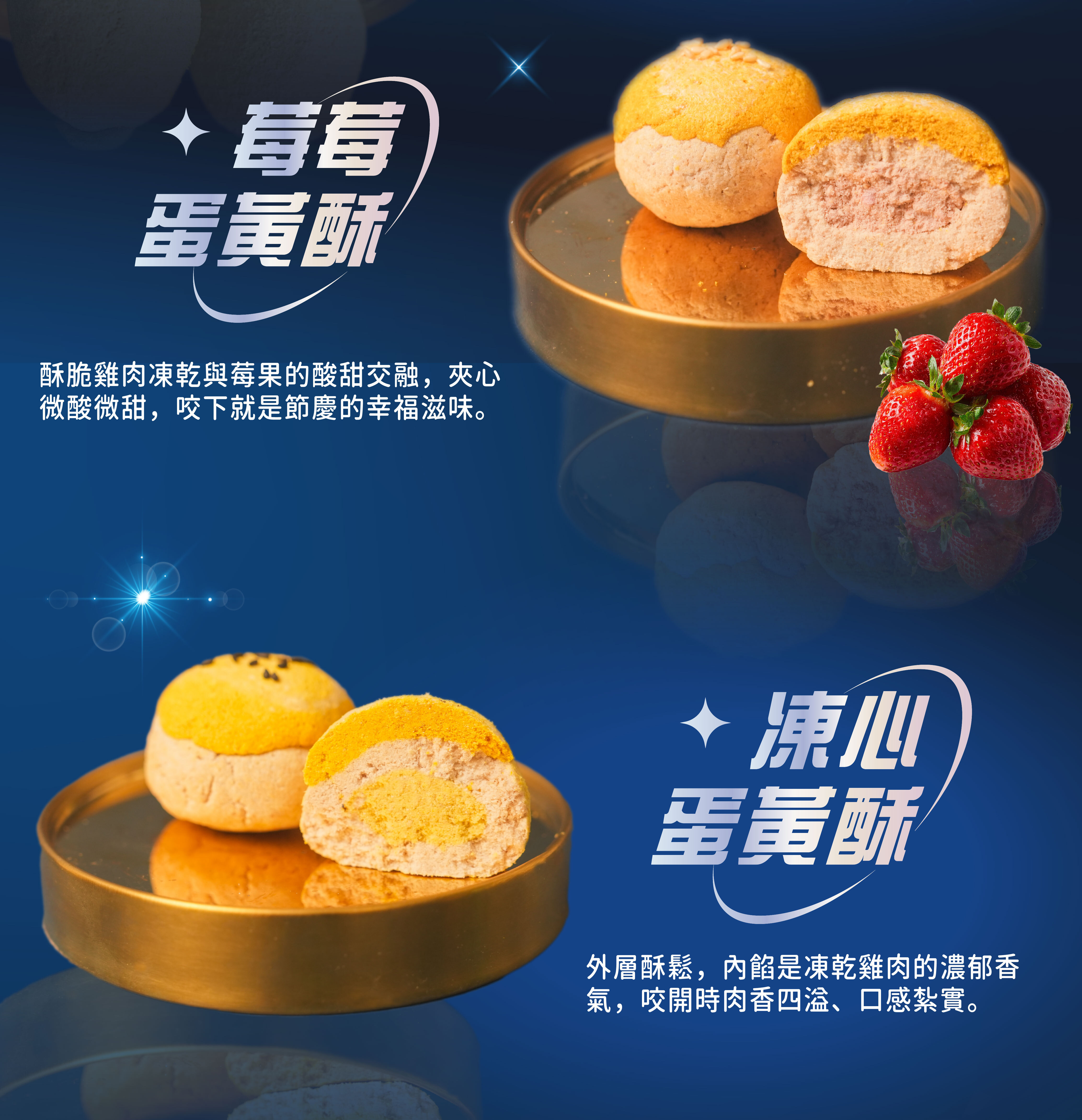 - 莓莓蛋黃酥 x 1入:雞肉+馬鈴薯+薑黃+草莓
