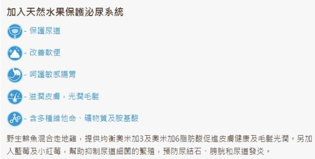 • 含藍莓﹑小紅莓及DL-蛋氨酸(DL-METHIONINE),有助保持尿道健康,預防尿道發炎及結石
