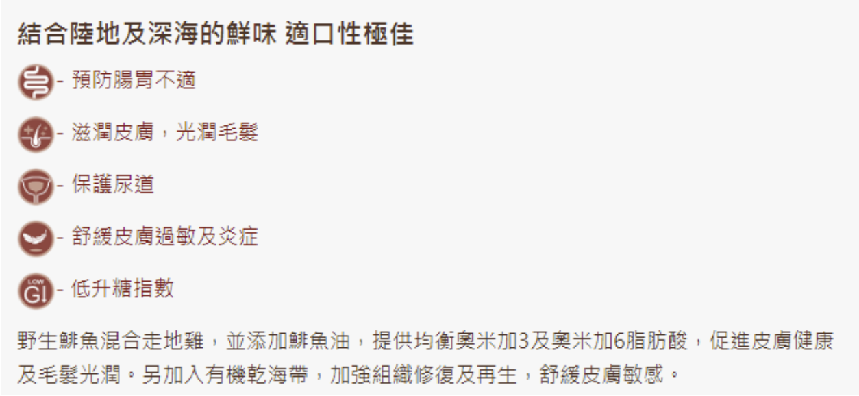 • 採用精簡食材配方,不含穀物及馬鈴薯,適合腸胃敏感的貓咪食用