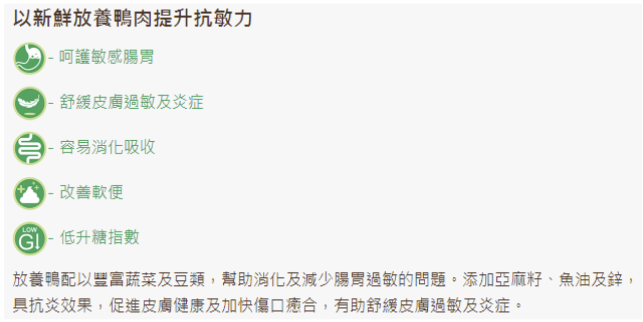 鴨肉粉、鷹嘴豆、扁豆、豌豆、芥花籽油(與生育酚,即維他命E混合)、苜蓿草粉、亞麻籽粉、魚油(與生育酚,即維他命E混合)、乾海帶、紅蘿蔔、歐芹、生菜、西洋菜、菠菜、西芹、氯化膽鹼、碳酸鈣、磷酸二氫鈉、乾嗜酸乳桿菌發酵物、枯草芽孢桿菌發酵產物、乾雙歧桿菌嗜熱發酵物、乾長雙歧桿菌發酵物、乾屎腸球菌發酵物、鋅蛋白、維他命E補充劑、硫酸鋅、硒酵母、硫酸亞鐵、銅蛋白、錳蛋白、維他命A補充劑、硫酸銅、煙酸、泛酸(維他命B5)、維他命B12補充劑、硫酸錳、核黃素、生物素 (維他命B7)、維他命D3補充劑、鈷蛋白、硫胺素硝酸鹽 (維他命B1硝酸鹽 )、葉酸 (維他命B9)、亞硒酸鈉、碘酸鈣