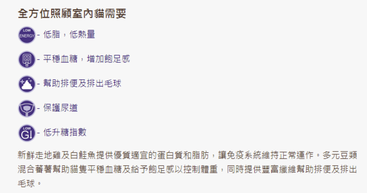 • 高纖低卡配方切合香港低運動量室內貓的需要,有助管理體重及控制熱量攝取