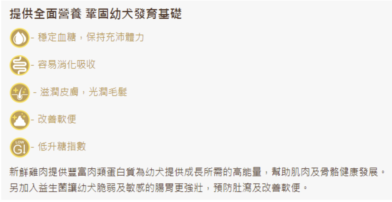 若幼犬每天食量超過2杯,可把份量分為2餐。由於年齡、品種、環境、活動水平和身體狀況不同,狗隻的食物需求可能跟餵養指南不同,請根據需要而調整餵食量以保持理想體重,避免過度餵食。另外,請隨時為愛寵提供新鮮及乾淨的飲用水。