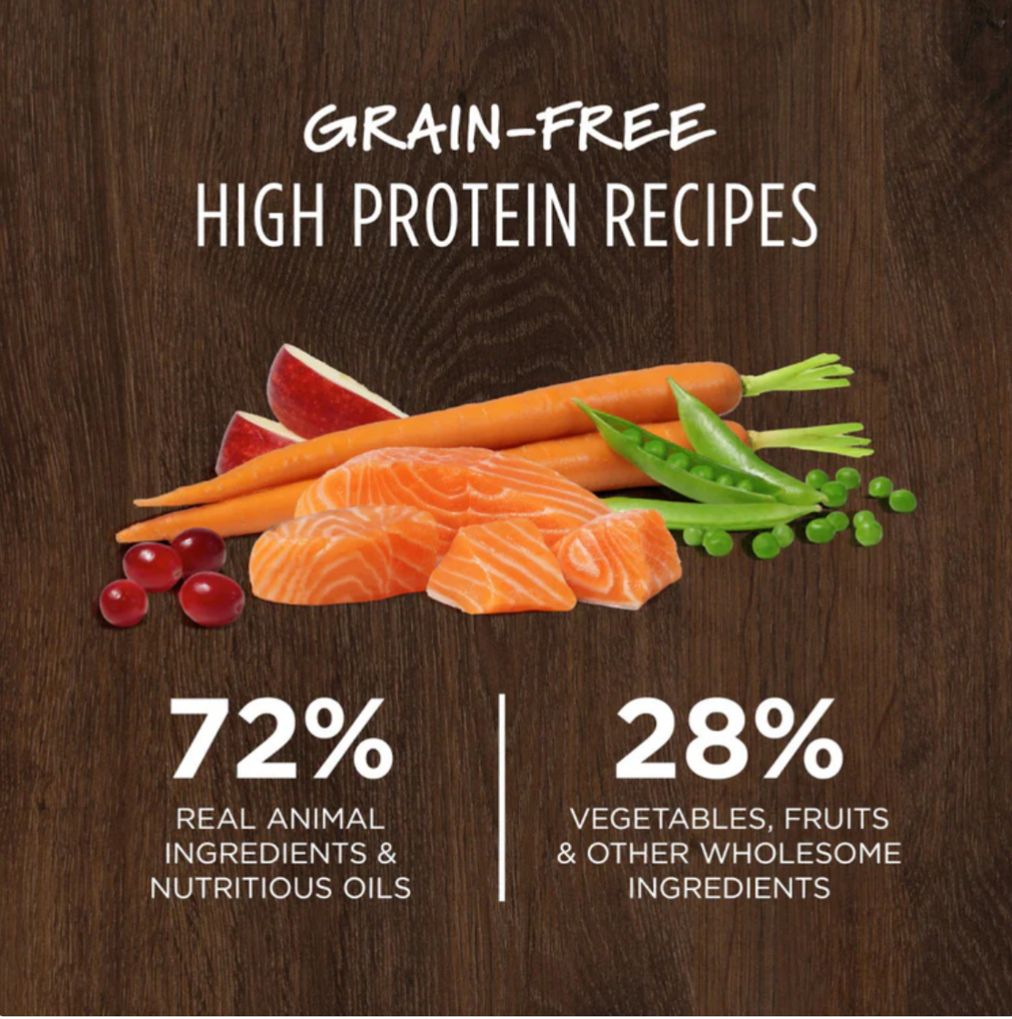 - 72% 真正動物食材和營養油; 28% 蔬菜﹑水果和其他有益健康的食材