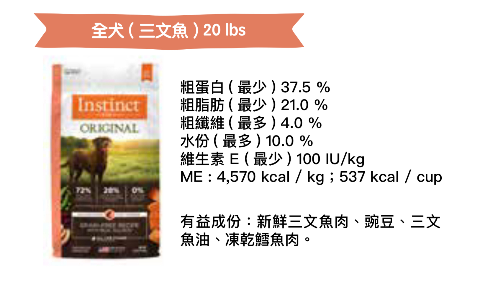 三文魚肉,白魚粉(太平洋鱈魚,太平洋龍脷,太平洋石斑魚),豌豆,曼哈頓魚粉,芥花籽油(混合生育酚和檸檬酸保存),希靈魚粉,鷹咀豆,豌豆蛋白,天然香料,木薯粉,乾番茄渣,胡蘿蔔,蘋果,蔓越莓,蒙脫石粘土,維生素(左-抗壞血酸-2-多磷酸鹽,維生素E補充劑,菸酸補充劑,維生素A補充劑,硫胺素單硝酸鹽,D-鈣泛酸鹽,核黃素補充劑,鹽酸吡哆醇,維生素B12補充劑,葉酸,維生素D3補充劑,生物素),氯化膽鹼,礦物質(鋅蛋白,鐵蛋白,銅蛋白,錳蛋白,亞硒酸鈉,二水乙二胺),凍乾鱈魚,芽孢乳酸菌,迷迭香提取物。