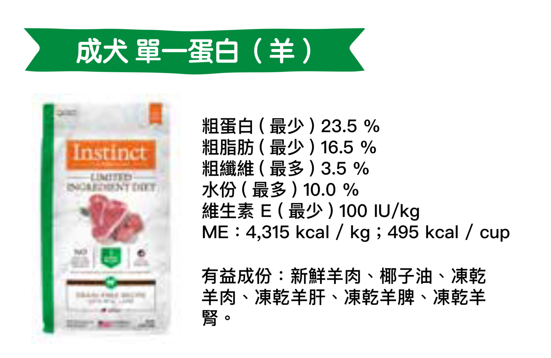 羊肉粉,豌豆,木薯粉,豌豆蛋白,芥花籽油(混合生育酚和檸檬酸保存),羊肉,天然香料,蒙脫石粘土,椰子油,鹽,維生素(維生素E補充劑,左-抗壞血酸-2-多聚磷酸鹽,菸酸補充劑,硫胺素單硝酸鹽,D-鈣泛酸鹽,維生素A補充劑,核黃素補充劑,鹽酸吡哆醇,維生素B12補充劑,葉酸,維生素D3補充劑,生物素),氯化鉀,氯化膽鹼,DL-蛋氨酸,礦物質(鋅蛋白,鐵蛋白,銅蛋白,錳蛋白,亞硒酸鈉,二水乙二胺),凍乾羊肉,南瓜籽,凍乾羊肝,凍乾雞脾,凍乾雞心,凍乾羊腎,迷迭香提取物。