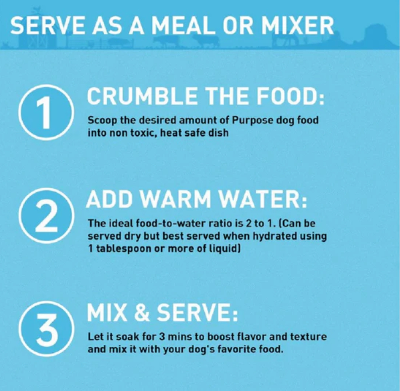 加水進食:將主糧弄碎並加入暖水。(每兩塊肉餅加四分之一杯水)