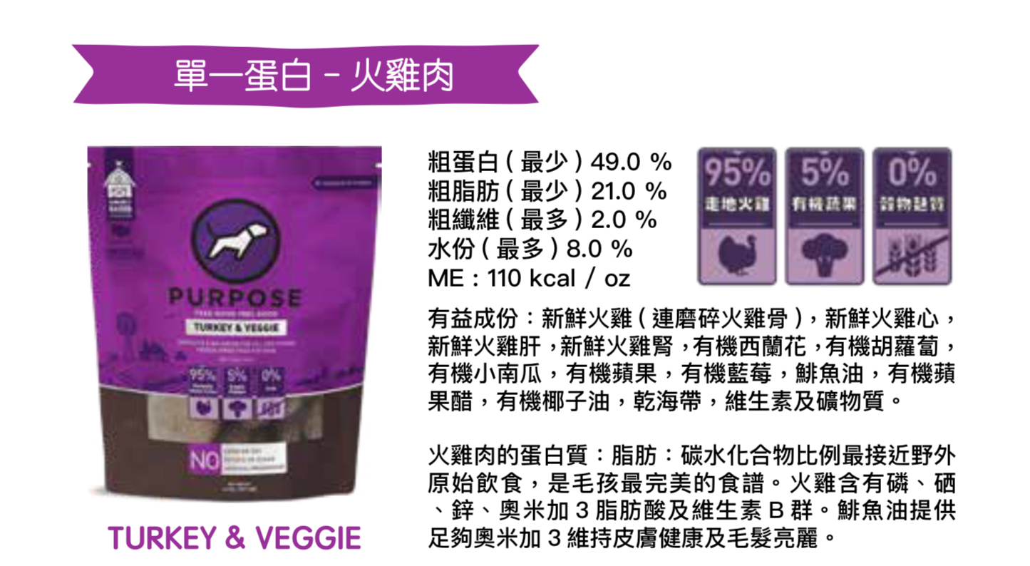 新鮮火雞 ( 連磨碎火雞骨 ),新鮮火雞心,新鮮火雞肝,新鮮火雞腎,有機西蘭花,有機胡蘿蔔,有機小南瓜,有機蘋果,有機藍莓,鯡魚油,有機蘋果醋,有機椰子油,氯化鉀,乾海帶,氯化鈉,鋅蛋白,鐵蛋白,維生素E補充劑,維生素B3補充劑,銅蛋白酸鹽,錳蛋白酸鹽,硫酸單硝酸鹽,d-泛酸鈣,亞硒酸鈉,維生素B2補充劑,維生素B7補充劑,鹽酸吡哆醇,維生素B12補充劑,葉酸,維生素D3補充劑。