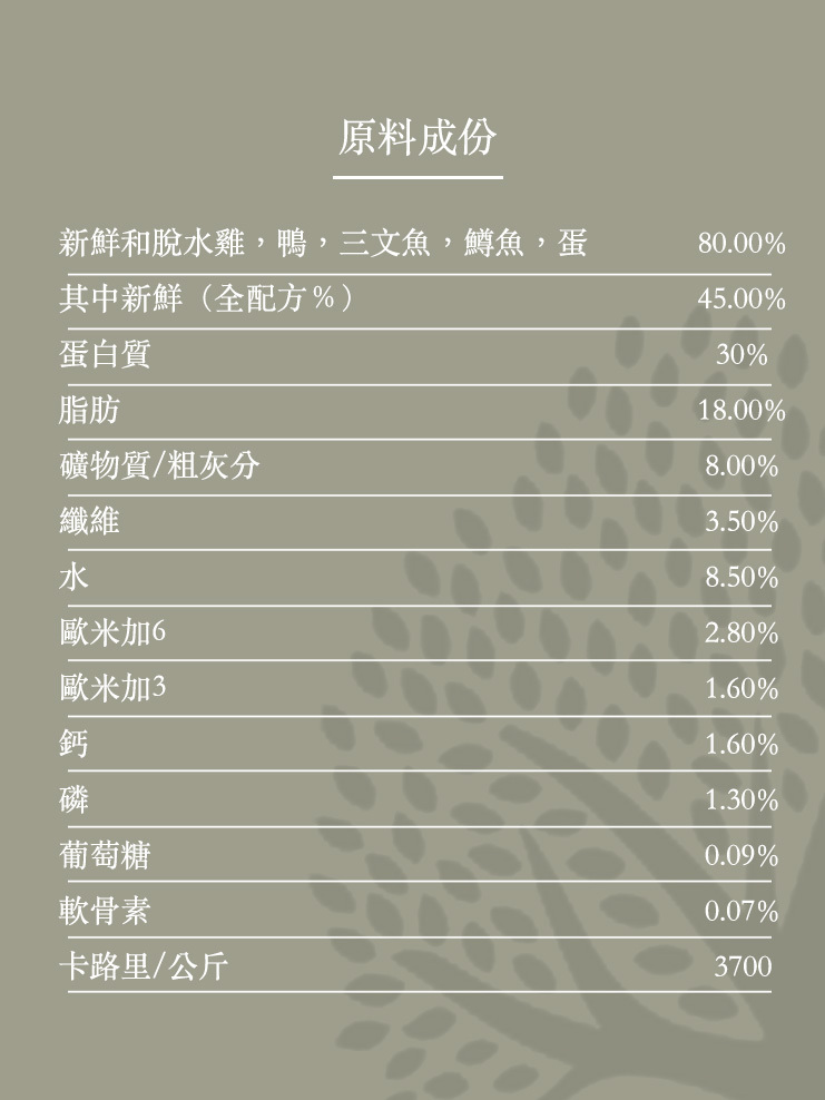 新鮮雞肉和鴨肉,脫水雞肉和鴨肉,甜豌豆,豌豆,新鮮三文魚和鱒魚,亞麻籽,新鮮全蛋,雞脂,土豆,肝臟,苜蓿芽,維生素,礦物質,MOS,FOS,葡糖胺*軟骨素*,MSM*(*全部來自天然來源),小紅莓,巴西莓,藍莓,桑莓,蘋果,番茄,橙,梨,胡蘿蔔,菠菜,花草,紫菜,萬壽菊,人參,綠茶,生薑。