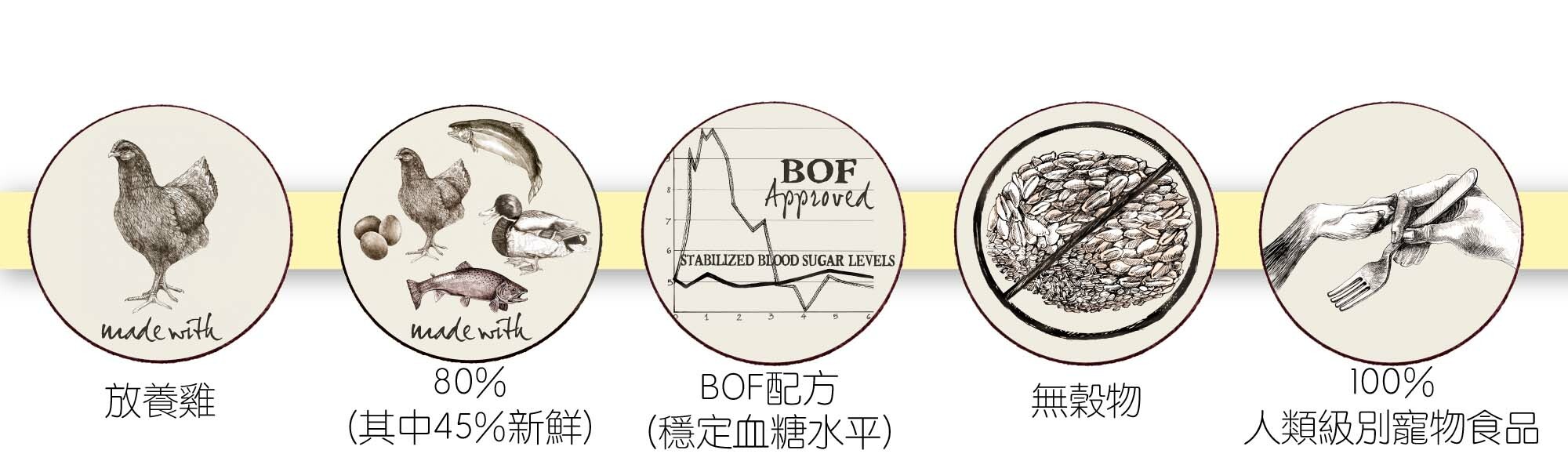 BOF(Behavioural Optimised Food)優化行徑食品是按照最貼近天然食譜而研發的配方,從而符合你愛犬(貓)營養所需的一種食品製作原則。這一點我們已經實現了!我們的食物確保狗血糖水準的穩定性。它的新鮮肉類含量高,可激發狗狗的本能。還有,低溫的烘焙技術意味著你的狗狗可獲得最好的營養價值。至於,漿果、種子和草藥則模仿在大自然中捕獲的獵物的胃內容及易膳寵食每粒大小的一致性,可確保食品在狗狗吞咽前有被適當地咀嚼。