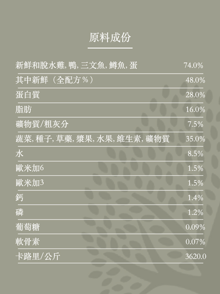 新鮮雞肉和鴨肉,脫水雞肉和鴨肉,豌豆,新鮮三文魚和鱒魚,新鮮全蛋,亞麻籽,雞脂,馬鈴薯,肝臟,苜蓿芽,維生素,礦物質,MOS,FOS,葡糖胺*,軟骨素-錫,*MSM*(*全部來自天然來源),小紅莓,巴西莓,藍莓,桑莓,蘋果,番茄,橙,梨,胡蘿蔔,菠菜,花椰菜,紫菜,萬壽菊,人參,綠茶,生薑。